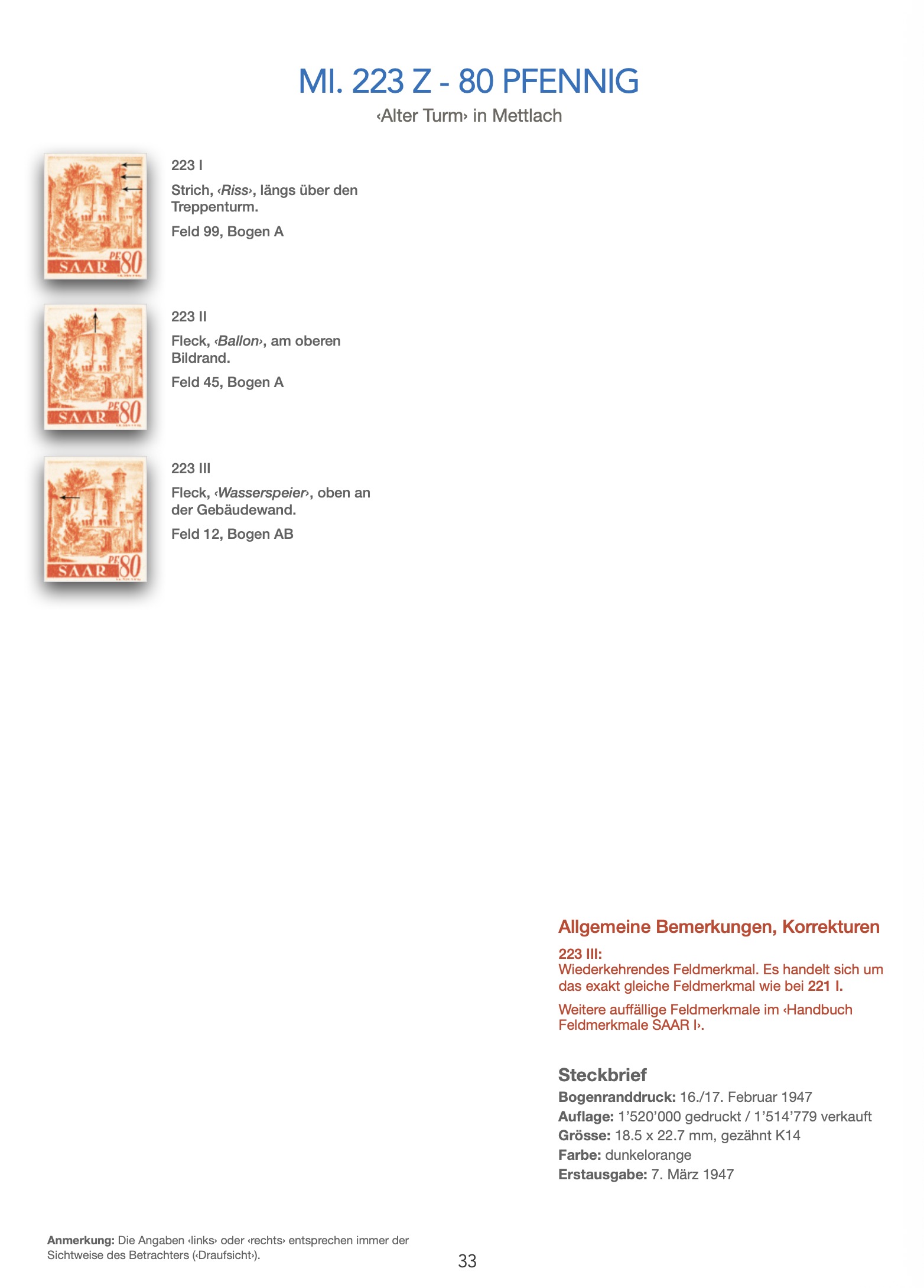 Sur 38 pages, tous les défauts/variétés sont illustrés et décrits correctement. La brochure figurent dans la liste des publications du groupe d’étude philatélique de la Sarre.